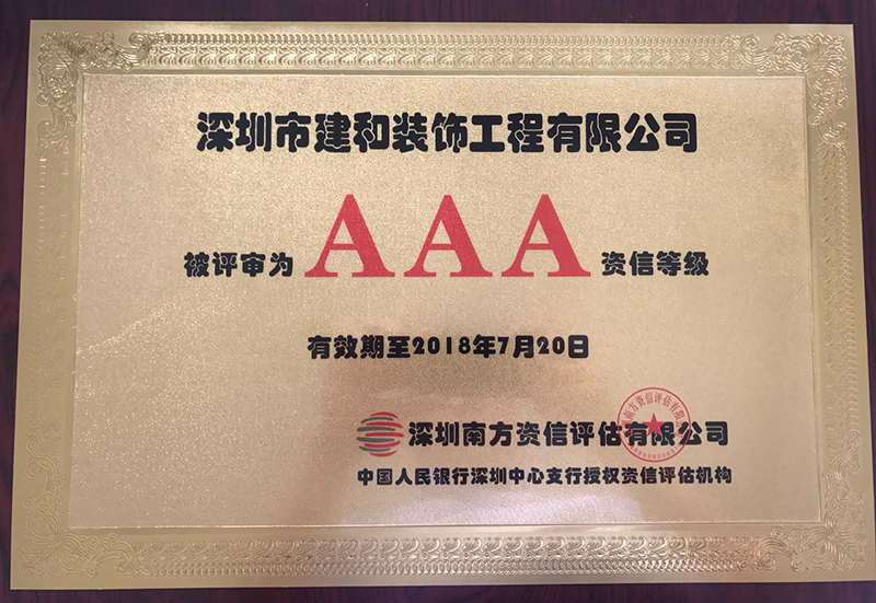 熱烈祝賀深圳市建和裝飾榮獲銀行“AAA級資信等級證書”