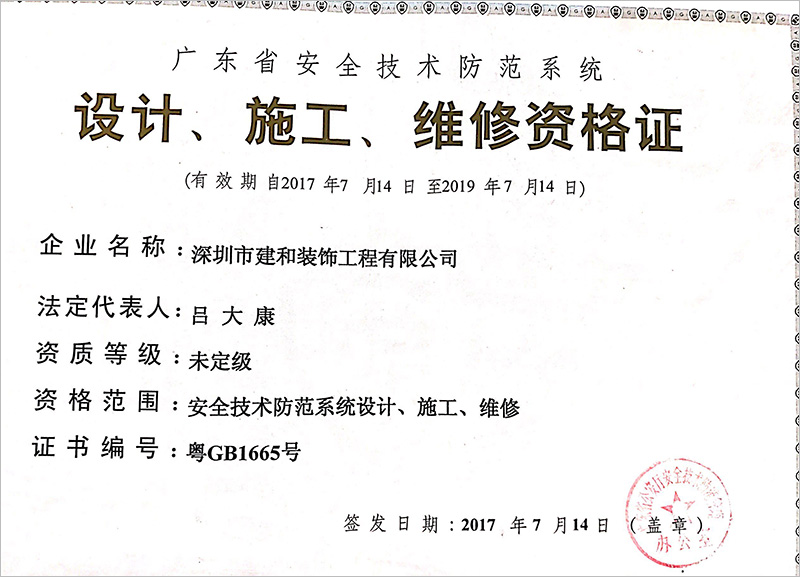 熱烈祝賀我司喜獲“廣東省安全技術(shù)防范系統(tǒng)設(shè)計(jì)、施工、維修資格證”