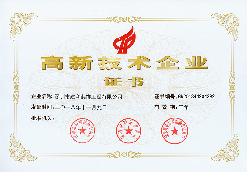 深圳市建和裝飾工程有限公司于2018年11月9日再次獲得“國家高新技術企業“認證。