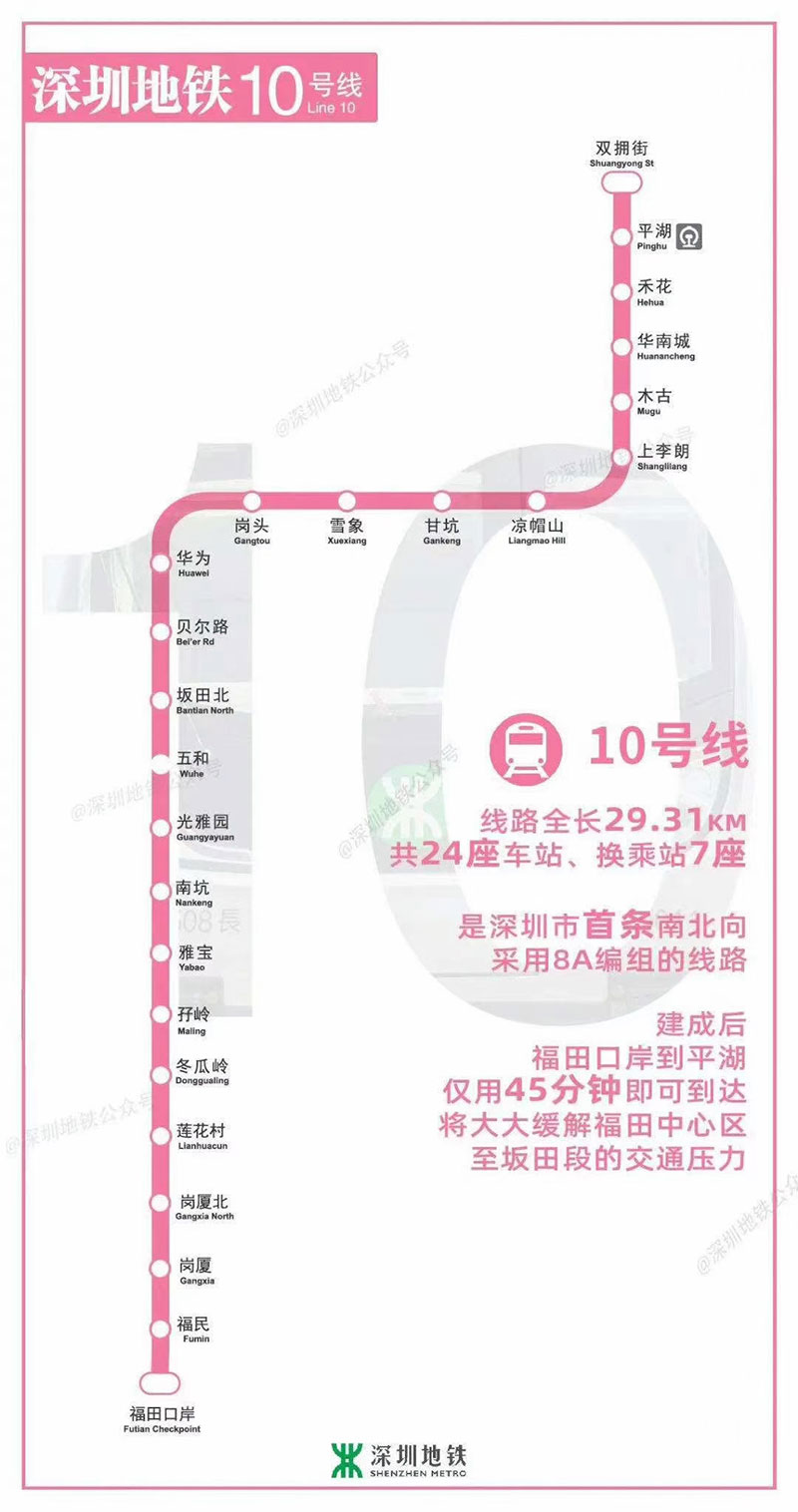 深圳地鐵10號線南連與香港毗鄰的福田口岸站,北接龍崗區的平湖樞紐,全長32.5公里,是深圳市中部發展軸的重要線路。通車后,市民乘地鐵由福田口岸到平湖僅需45分鐘。