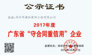近日,建和裝飾榮獲由廣東省工商行政管理局頒發的“廣東省守合同重信用企業”(2017),據了解,“廣東省守合同重信用企業”評選是為了鼓勵企業加強合同和信用管理,促進當地企業信用體系建設,活動在廣東省全面開展以來,得到了社會各界和廣大企業的充分認可 ...